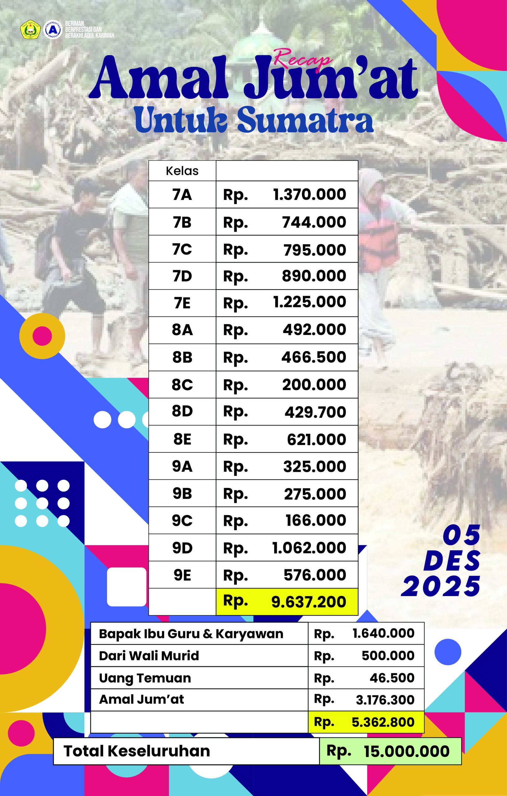 Alhamdulillah dengan Rahmat Allah SWT. Pada hari Jum’at (05 Desember 2025) kemarin, keluarga besar MTs Khadijah Malang memberikan sedikit bantuan kepada para korban bencana alam di Sumatra sebesar Rp15.000.000,00. Dana tersebut terkumpul dari infaq para Siswa-siswi, dewan guru, karyawan, wali murid, dsb. dengan rincian pada gambar.